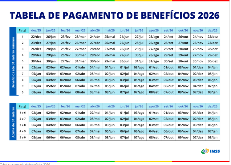O Instituto Nacional do Seguro Social (INSS) disponibilizou o calendário de pagamentos de benefícios referente a 2026. A versão em PDF está acessível pelo site e pelo aplicativo Meu INSS.